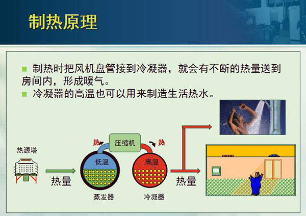 4.冬季將水蒸氣中的熱能取出來(lái)用以制熱、制造生活熱水,完全不用鍋爐。