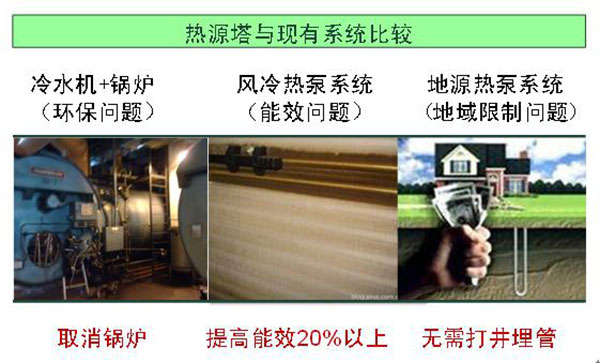傳統(tǒng)水冷冷水機(jī)只能制冷,熱源塔熱泵系統(tǒng)不僅可以制冷制熱,還可制取生活熱水,一機(jī)三用。 可以取消鍋爐房,解除安全顧慮,達(dá)到節(jié)省機(jī)房用地、節(jié)省操作人員、節(jié)省運(yùn)行費(fèi)用、減少碳排放的效果。 熱源塔熱泵系統(tǒng)的功能與地源熱泵系統(tǒng)都可一機(jī)三用,但是其造價(jià)卻比地源熱泵低得多,也不必顧慮地源熱泵系統(tǒng)由于地下?lián)Q熱器的計(jì)算問(wèn)題或是施工質(zhì)量問(wèn)題所引起的失敗風(fēng)險(xiǎn)。