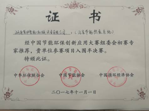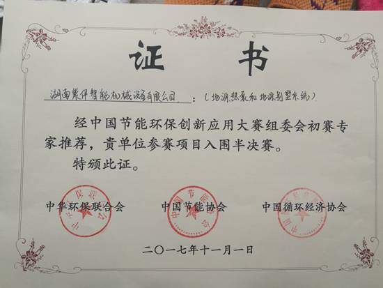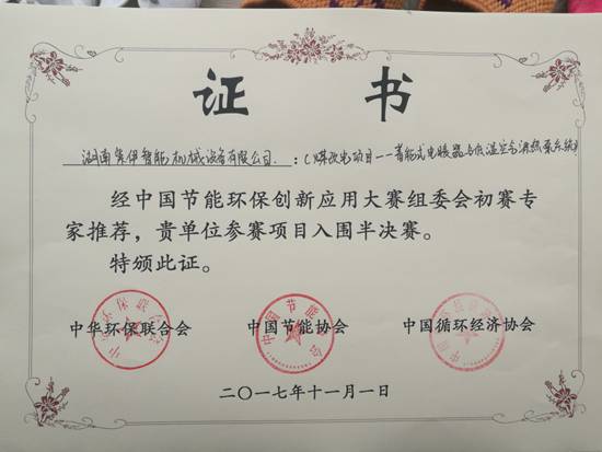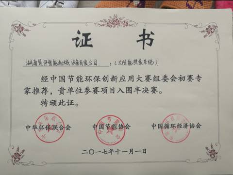2017年11月3日--湖南紫伊智能機械設備有限公司與江蘇辛普森新能源有限公司戰略聯盟參加由中華環保聯合會、中國節能協會、中國循環經濟協會主辦的“中國首屆節能環保創新應用大賽”,申報的五項新能源項目系統(1、大氣能熱源塔熱泵系統;2、太陽能熱泵系統;3、浴室節能熱泵系統;4、地源熱泵與地源別墅系統;5、煤改電項目-蓄能式電暖器與低溫空氣能熱泵系統)全部榮獲半決賽入選項目!